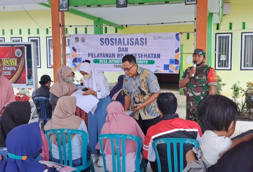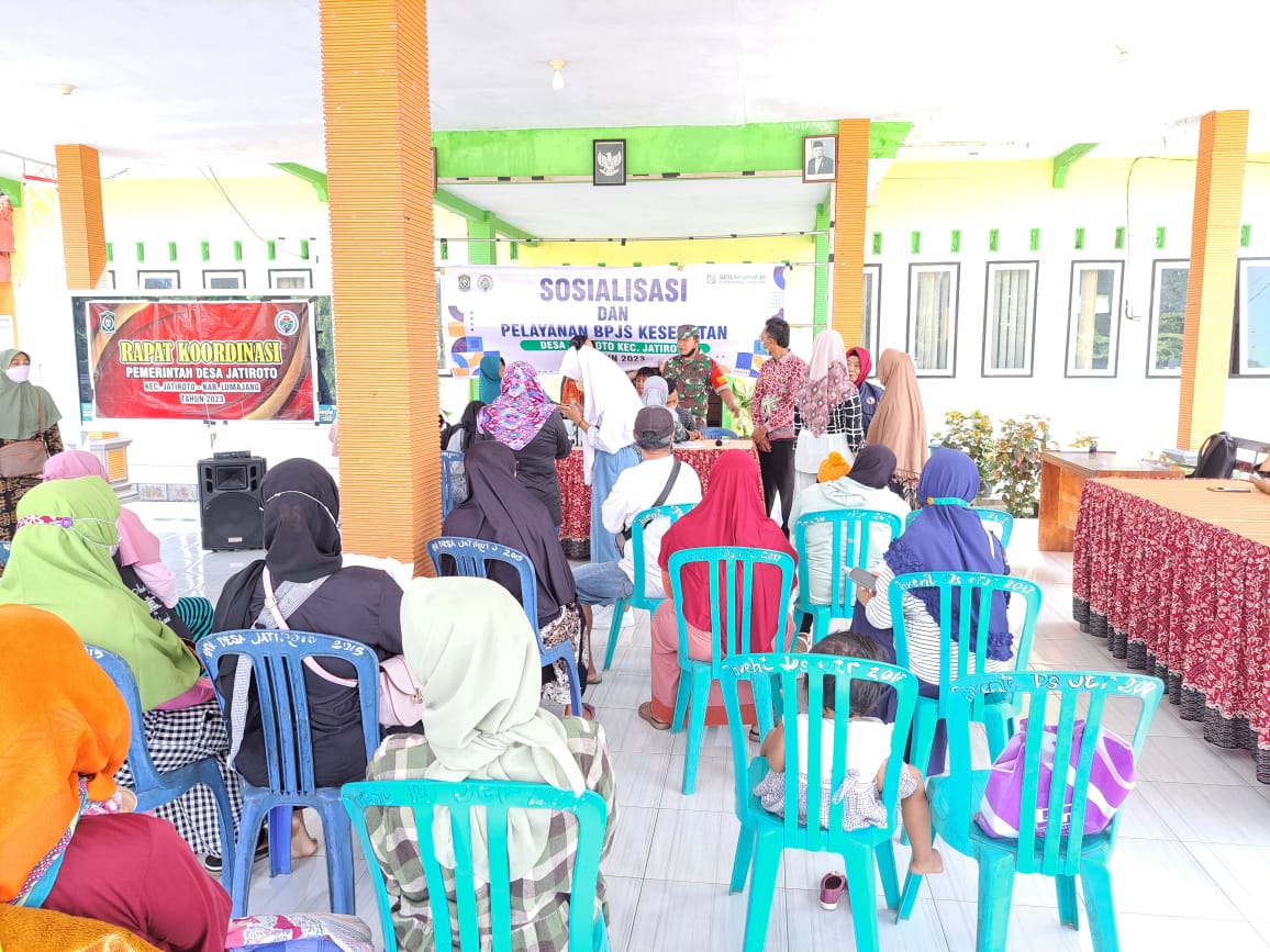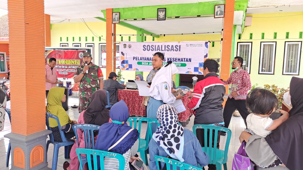 Babinsa Jatiroto Koramil 0821/12 Jatiroto Serda Ahmad Agus Budi Santoso, melaksanakan pendampingan sosialisasi dan pelayanan, Badan Penyelenggara Jaminan Sosial (BPJS) kesehatan, bertempat di kantor kepala desa Jatiroto Kecamatan Jatiroto Kabupaten Lumajang, Jawa Timur, Sabtu (3/6/2023).