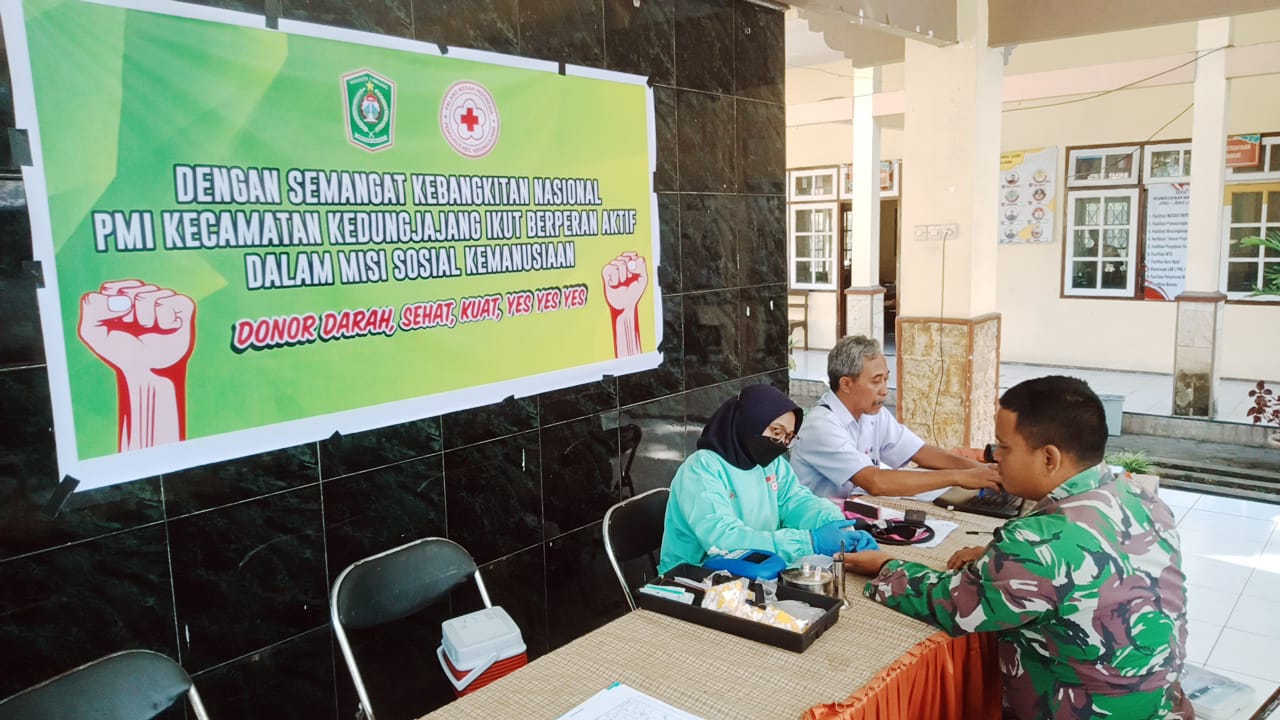 Personel TNI Pos Koramil 0821/05 Kedungjajang Lumajang, melaksanakan giat baksos donor darah di Balai Kecamatan Kedungjajang, Senin (29/5/2023).