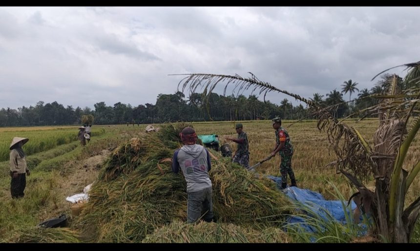 Gotong Royong Hanpangan, Babinsa Rojopolo Dampingi Panen Padi di Pondok Sari
