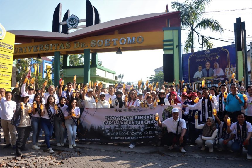 Surabaya, pedulirakyat.id Ratusan civitas akademika Universitas Dr. Soetomo (Unitomo) bersama jajaran kecamatan Sukolilo, Kelurahan Menur Pumpungan, dan Dinas Lingkungan Hidup Kota Surabaya Minggu (20/07) pagi melakukan aksi bersih-bersih sungai yang…