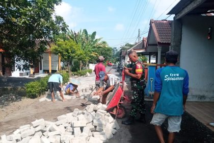 Giatkan Binter Wilayah, Babinsa Dan Warga Kedungrejo Karya Bakti Pemasangan Paving