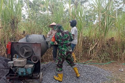 Gotong Royong, Babinsa Bersama Warga Desa Tunjung Bangun Jalan Rabat Beton