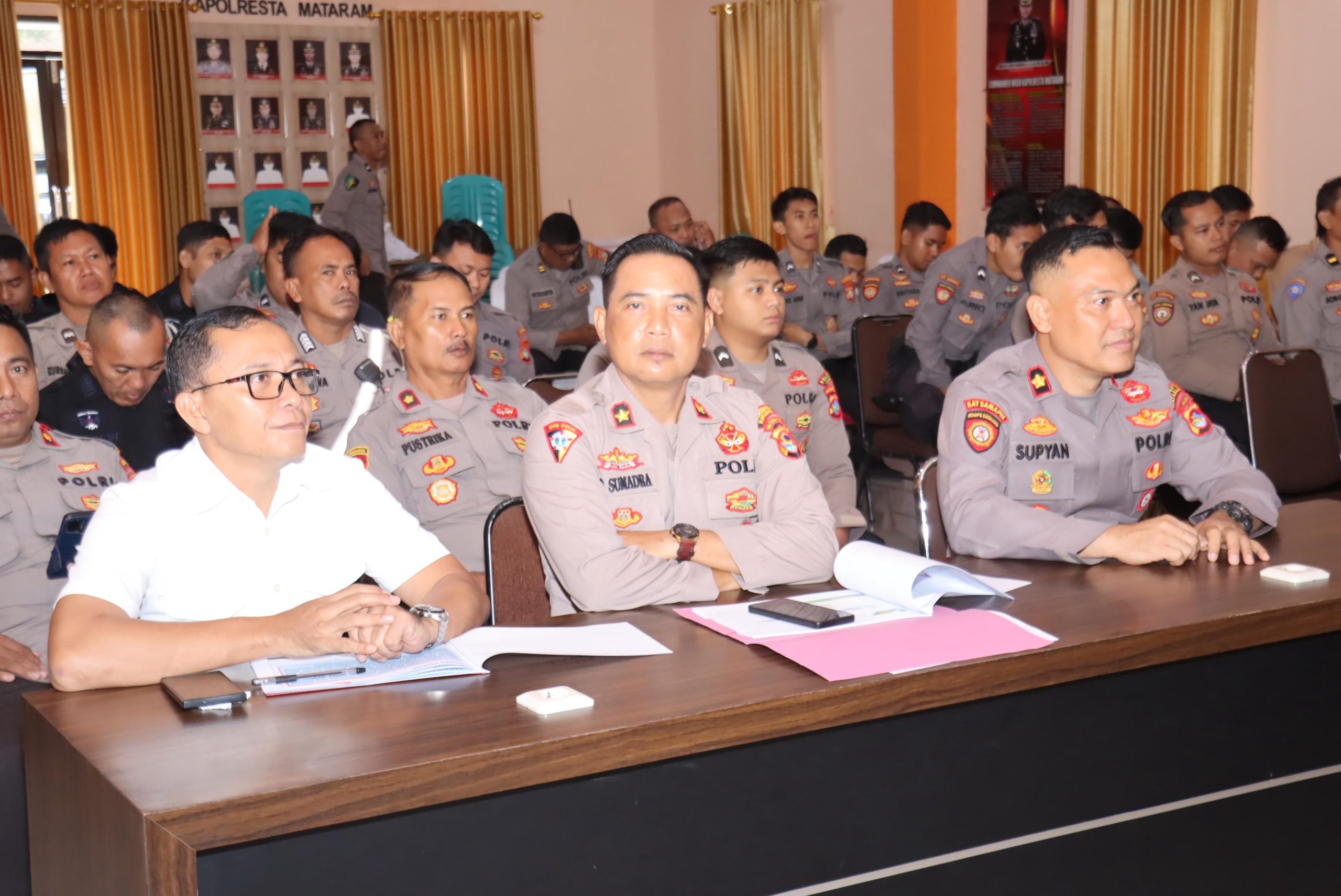 Di Gedung Wira Pratama Polresta Mataram tampak hadir Kapolresta Mataram Kombes Pol. Dr. Ariefaldi Warganegara, S.H., S.I.K., M.M., CPHR., CBA., CHRM., Wakapolresta Mataram, Para Kasat, Segenap PJU Polresta Mataram serta Perwira Polri Polresta Mataram.