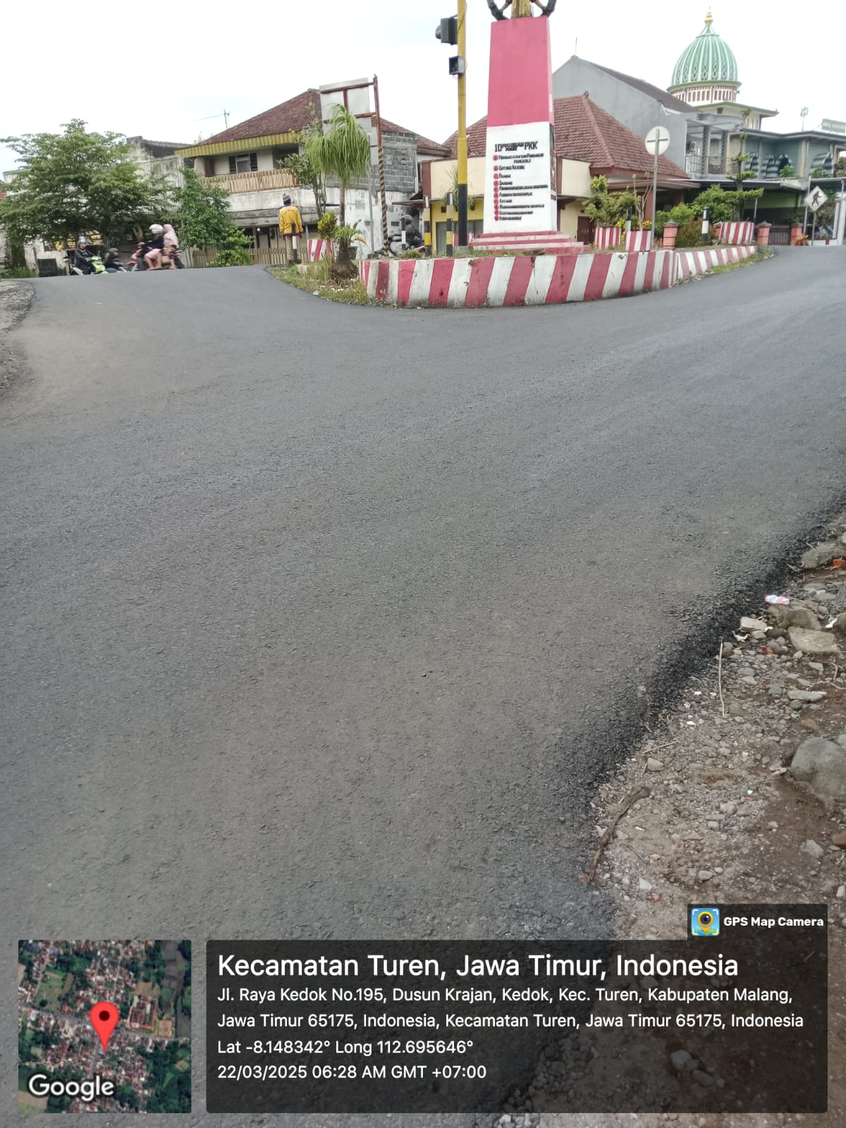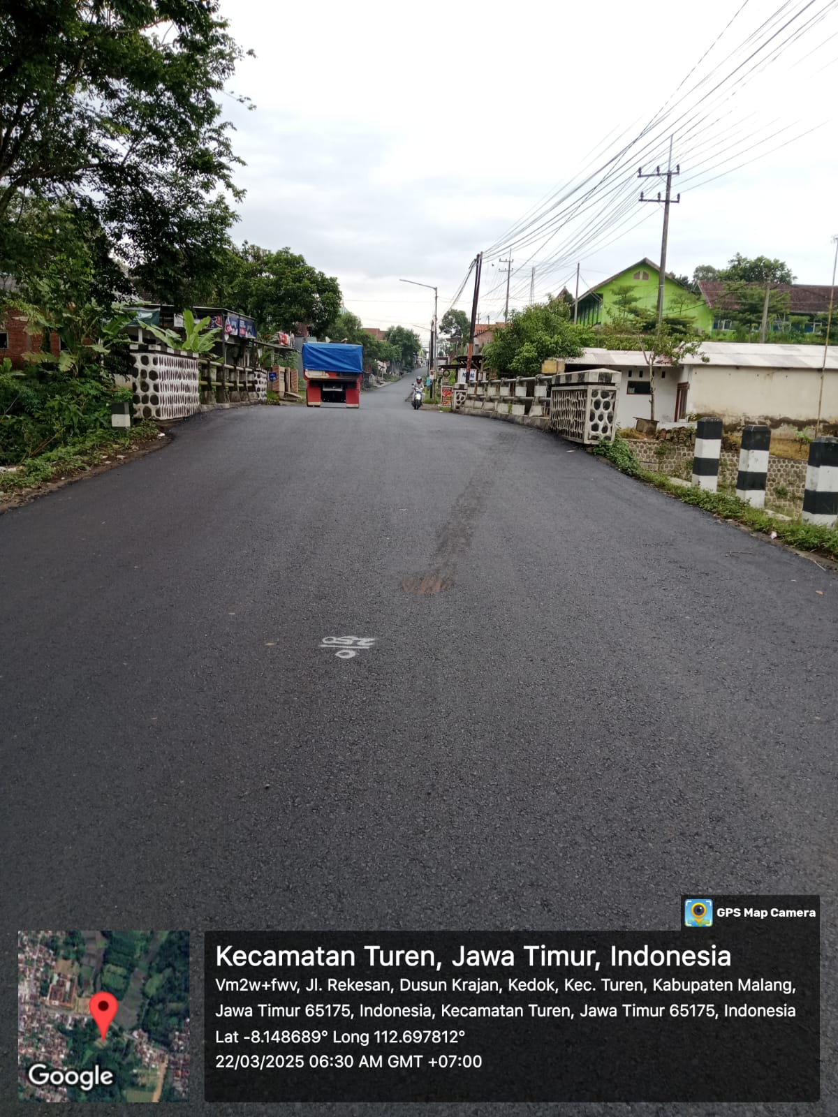 Pemerintah kabupaten malang melalui dinas PU bina marga telah merampungkan pembangunan peningkatan jalan dengan aspal hotmix sepanjang ±600 meter dan lebar 5 meter dijalan rekesan dusun Krajan desa kedok kecamatan turen kabupaten malang pada Sabtu 22/03/2025