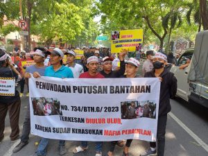 Dari sejumlah orang mengatasnamakan Aliansi Masyarakat Peduli Keadilan (AMPI) menggeruduk Pengadilan Negeri (PN) Surabaya. Mereka berunjuk rasa lantaran kasus tanah di Jalan HR Muhammad di Kelurahan Putat Gede yang telah ditetapkan Juru eksekusinya dengan nomor 76/eks/2020/PN.Sby jo. Nomor 138/Pdt.G/2016/PN.Sby jo. No. 285/Pdt/2017/ PT.Sby tanggal, 21 Februari 2022 gagal dilakukan.