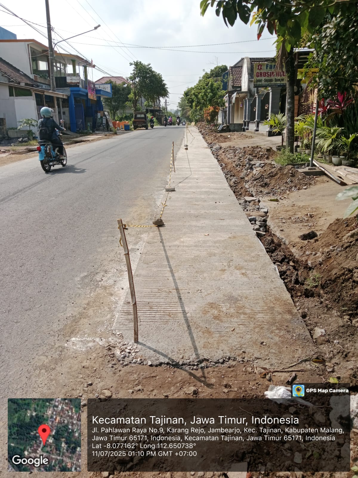 Pemerintah kabupaten Malang melalui dinas PU Binamarga terus giat mengerjakan pembangunan pelebaran rabat beton bahu jalan pahlawan raya karangrejo jambearjo kecamatan tajinan pada hari jum’at 11/07/2025. Nampak baru saja selesai dikerjakan. dan dari pantauan awak media hari jum’at 11/07/2025 pekerjaan pembangunan pelebaran rabat beton bahu jalan yang berada di jambearjo kecamatan tajinan sudah selesai dikerjakan.